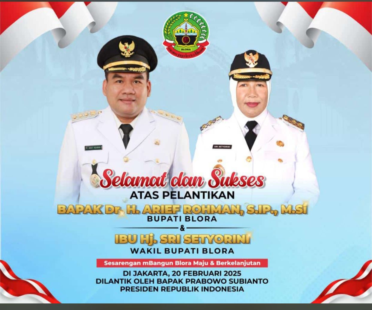 Pada Kamis, 20 Februari 2025, Presiden Republik Indonesia, Prabowo Subianto, secara resmi melantik Bupati dan Wakil Bupati Blora terpilih, Arief Rohman dan Sri Setyorini, untuk masa jabatan 2025-2030. Upacara pelantikan berlangsung di Istana Negara, Jakarta, dan merupakan bagian dari prosesi pelantikan serentak yang melibatkan 961 kepala daerah dari seluruh Indonesia.